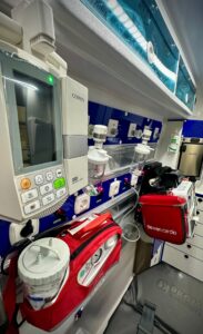 Respecto al equipamiento sanitario principal, cuenta con una camilla de transporte marca PROMEBA modelo PC-901 con colchón termosellado. La camilla además tiene un sistema de fijación seguro a bancada, altura regulable, respaldo articulado y ruedas con freno. El vehículo también incorpora una bancada de transporte marca PROMEBA, modelo PB-410. Una nevera médica marca VITRIFRIGO modelo FG10 COLD para conservación de medicamentos y vacunas a temperatura controlada y un calientasueros marca VITRIFRIGO modelo FG10 WARM para mantener sueros y fluidos a temperatura corporal antes de administración al paciente.